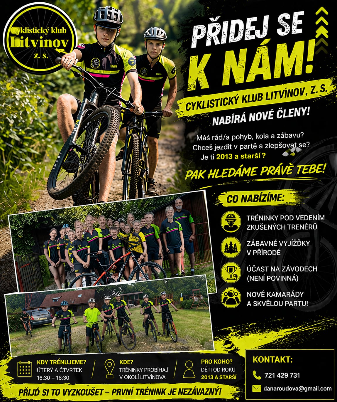 Závody rok 2026: 11. 04. 2026 – PO STOPÁCH PRAOTCE ČECHA – MTB maraton - startují i děti https://www.kralstredohori.cz/kolo/po-stopach-praotce-cecha 02. 05. 2026 – Milada cyklozávod https://miladatour.cz/cyklo/ - startují i děti 08. 05. - 09. 05. 2026 – EXTRÉM BIKE MOST...